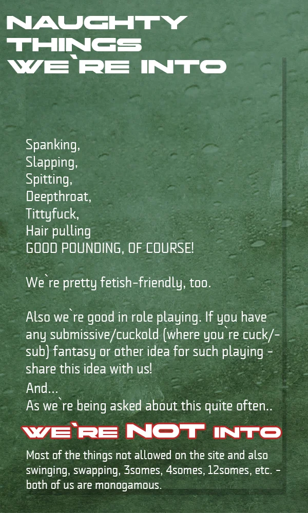 Doggy Style, Spanking, Oil Show, Ejaculation, Blowjob, Topless, Flashing, Nipple Toys, Tittyfuck, Deepthroat, Hardcore, Cumshot, SPH, Humiliation, just chill lol